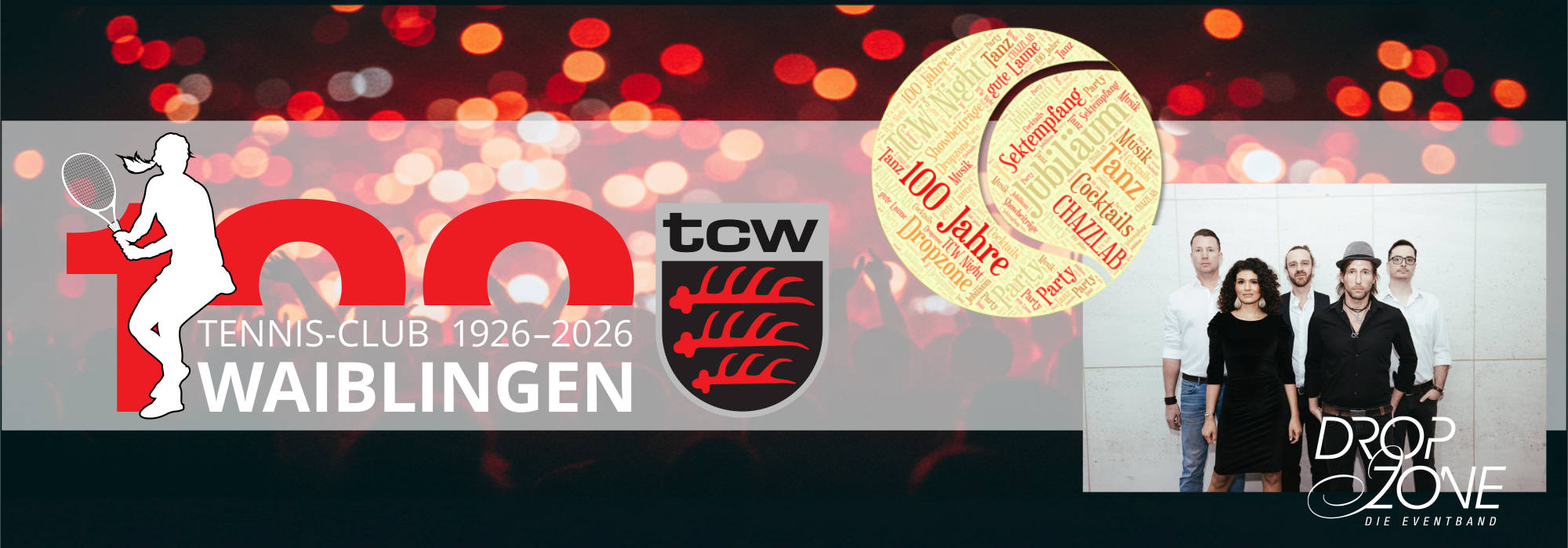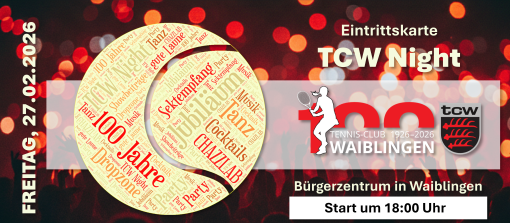 das neue Jahr startet mit einem Knall: 100 Jahre Tennis-Club Waiblingen. Das feiern wir mit unserer großen TCW-Night und ihr solltet unbedingt dabei sein!